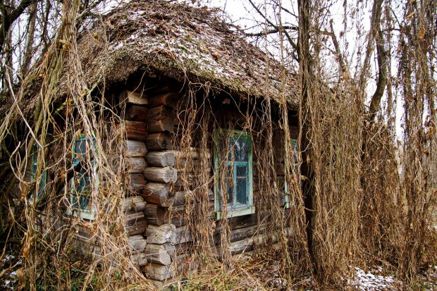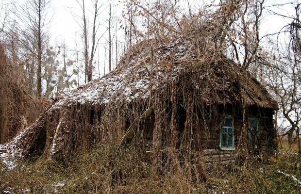 На пуеревянный сруб, соломенная крыша так густо оплетены дикими вьющимися растениями, что в избы едва видны окна-глазницы. Но они — целы. "Как, на удивление, уцелела вся эта старенькая Полесская избушка, хотя ее более новые дома-соседки из выселенных Ладыжич не выдержали испытания послеаварийными десятилетиями и понемногу рушатся в печали за хозяевами. А эта только еще больше увязла в родную землю, будто укоренилась, чтобы выдержать неумолимое влияние времени", — говорится в сообщении.