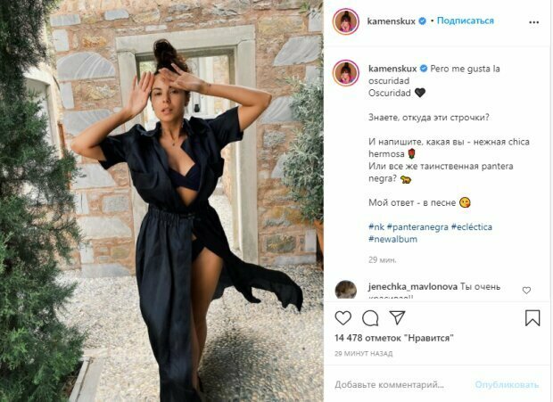«Pero me gusta la oscuridad. Oscuridad 🖤Знаете, откуда эти строчки? И напишите, какая вы — нежная chica hermosa 🌹 Или все же таинственная pantera negra? Мой ответ — в песне 😘», — интригующе написала Настя.