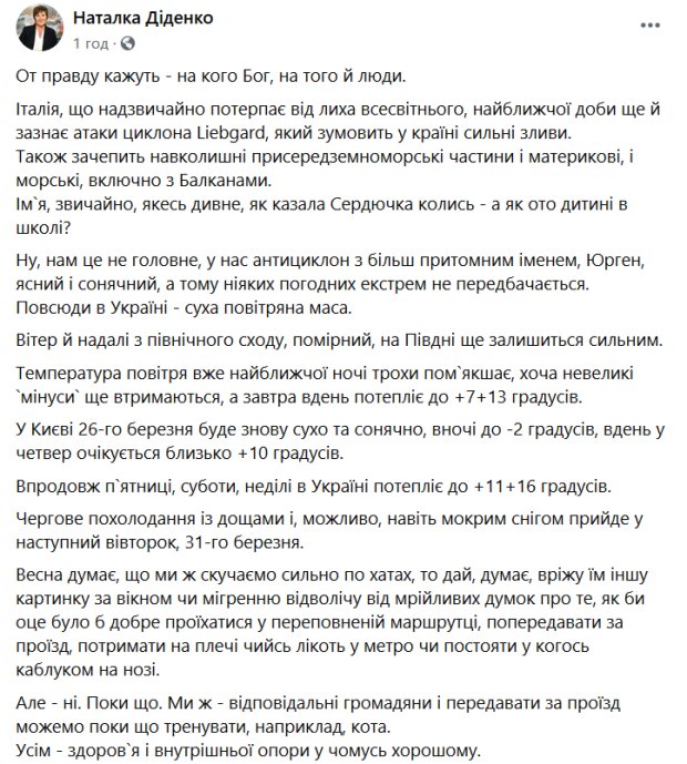 «Весна думает, что мы же скучаем сильно по домам, дай, думает, врежу им другую картинку за окном или мигренью отвлеку от мечтательных мыслей о том, как бы это было бы хорошо проехаться в переполненной маршрутке, попередавать за проезд, подержать на плече чей-то локоть в метро или постоять у кого-то каблуком на ноге», — с иронией отметила синоптик.