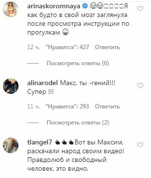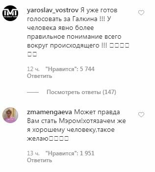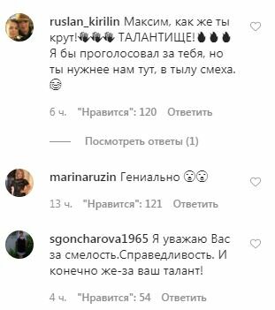 "Макс, ты просто гений", "Я бы проголосовал за тебя, но ты нужнее нам тут, в тылу смеха", "Я уважаю Вас за смелость. Справедливость. И конечно же — за ваш талант!", "Браво, Макс! Я вчера смотрела и сегодня на бис пересматривала", "Я уже готов голосовать за Галкина! У человека явно более правильное понимание всего вокруг происходящего!", "Может правда, Вам стать Мэром! Хотя зачем же я хорошему человеку такое желаю", "Я как будто в свой мозг заглянула после просмотра инструкции по прогулка", "Вот вы Максим, раскачали народ своим видео! Правдолюб и свободный человек, это видно", — написали фанаты в комментариях под видеороликом.