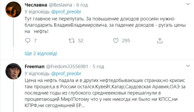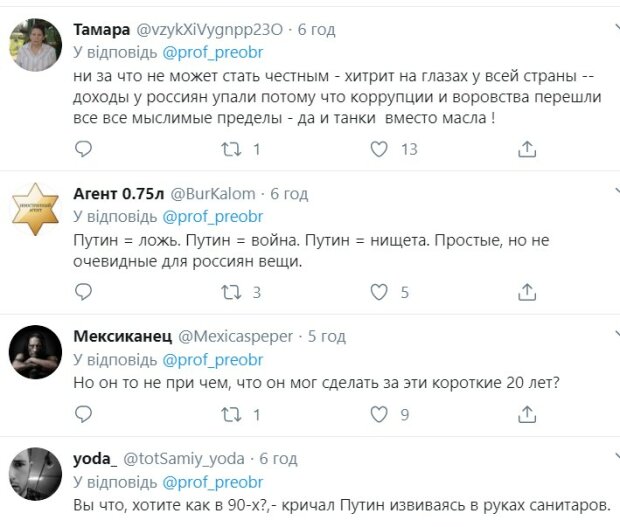 «Ни за что не может стать честным — хитрит на глазах у всей страны — доходы у россиян упали, потому что коррупции и воровства перешли все мыслимые пределы — да и танки вместо масла!», «Путин = ложь. Путин = война. Путин = нищета. Простые, но не очевидные для россиян вещи», «Тут главное не перепутать. За повышение доходов россиян нужно благодарить ВладимВладимировича, за падение доходов — ругать цены на нефть!», – пишут в комментариях.