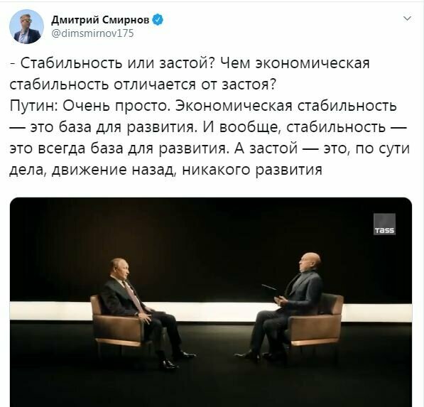 Среди прочих перлов, которые прозвучали в эфире «20 вопросов Владимиру Путину» президент РФ назвал главное различие между застоем и стабильностью в России.
