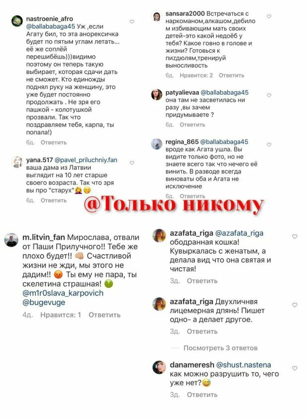 "Мирослава, отвали от Паши Прилучного! Тебе же плохо будет! Счастливой жизни не жди, мы этого не дадим. Ты ему не пара, ты скелетина страшная!"; "Ободранная кошка! Кувыркалась с женатым, а делала вид, что она святая и чистая"; "Уж, если Агату бил, то эта анорексичка будет по пятым углам летать…", — писали в комментариях в Инстаграм Мирославы.
