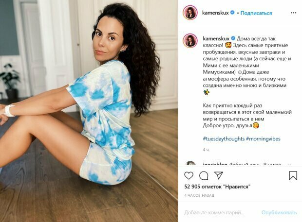 «Здесь самые приятные пробуждения, вкусные завтраки и самые родные люди (а сейчас еще и Мими с ее маленькими Мимусиками) Дома даже атмосфера особенная, потому что создана именно мною и близкими. Как приятно каждый раз возвращаться в этот свой маленький мир и просыпаться в нем», — написала звезда.