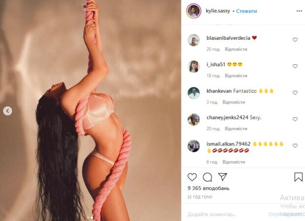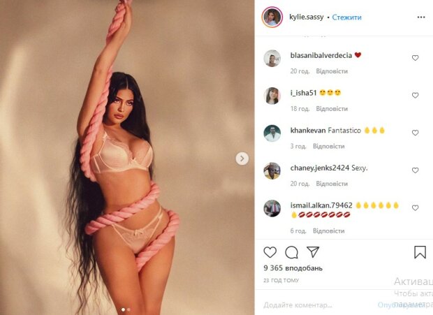 Так, на опубликованных снимках Дженнер позирует в кружевном белье, эффектно изогнувшись на камеру. При этом образ красотка дополнила распущенными волосами и канатом, который обвязала вокруг себя. Это стало причиной бурных комментариев со стороны ее поклонников.