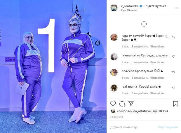 На снимке Сердючка запечатлена рядом с «мамой» (Инной Белоконь). артисты позируют в спортивных костюмах на фоне цифры «1», как бы намекая на свою популярность.