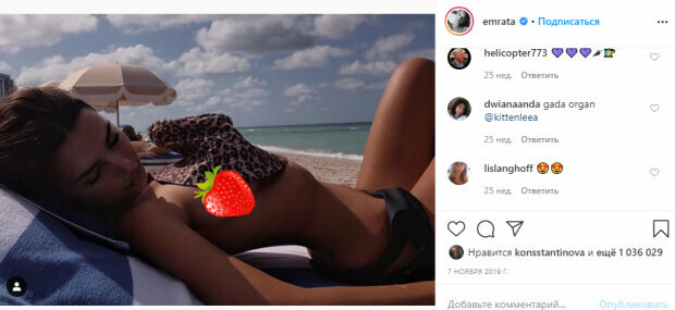 Ранее мы писали, что Эмили поделилась откровенным снимком с пляжа. Девушка полностью разделась, прикрыв грудь панамкой. Она лежала на пляже, изогнувшись в очень откровенной позе. Наверняка, окружающим было нелегко находится рядом с такой красоткой. Тонкая талия модели идеально сочеталась с ее упругими формами.
