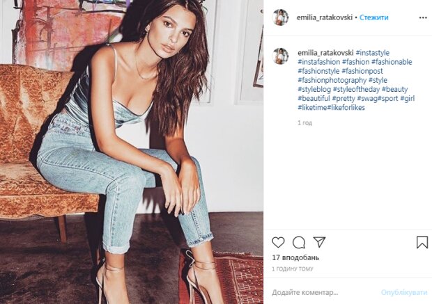 На фан-странице в Инстаграм появилось фото красотки с одной из ее фотосессий, сообщает Politeka.net. Эмили была одета в обтягивающие джинсы, которые подчеркнули ее длинные стройные ножки. Наверх модель надела блестящий тесный топ, в который едва вместила свою пышную грудь. Упругие формы почти выпрыгивали из одежды.