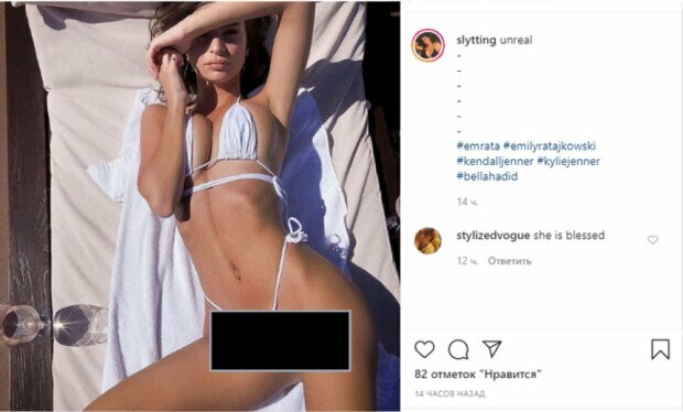 Также недавно Ратаковски поделилась фото в купальнике, который с трудом можно назвать полноценным купальным костюмом. Девушка разлеглась на лежаке в откровенной позе, а маленькие кусочки ткани на веревочке прикрыли часть ее груди и практически не смогли прикрыть главное достоинство модели.