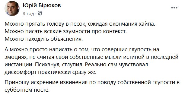 В новом посте на своем Фейсбук Бирюков извинился за свои оскорбительные слова и признал, что поступил глупо.