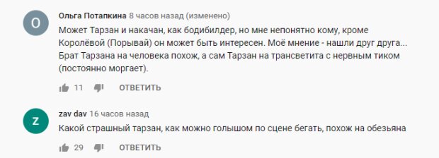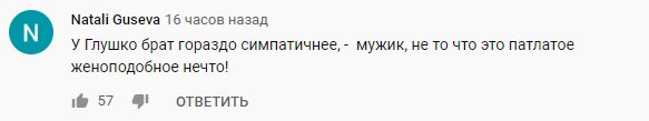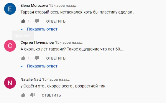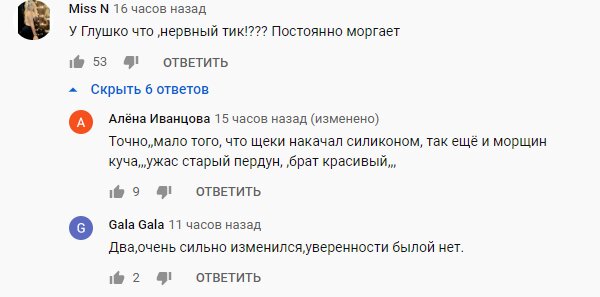 «Тарзан старый весь истаскался хоть бы пластику сделал», «А сколько лет Тарзану? Такое ощущение что лет 60..», «У Глушко брат гораздо симпатичнее, — мужик, не то что это патлатое женоподобное нечто!», «Брат Тарзана на человека похож, а сам Тарзан на трансветита с нервным тиком (постоянно моргает)», — отмечают люди.