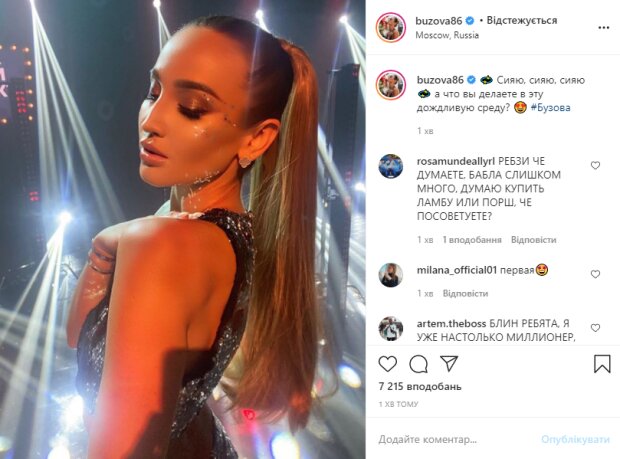 Судя по фону, Бузова в этот момент находилась на сцене — вся в лучах софитов.