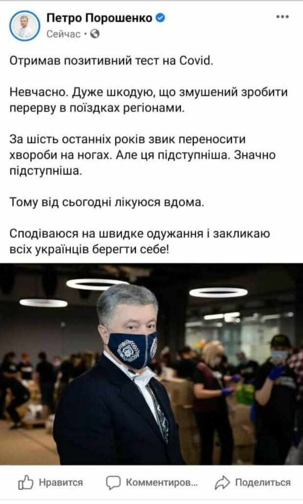 «Невовремя», — написал Порошенко. По его словам, в связи с болезнью ему придется на время отказаться от рабочих поездок по регионам Украины. Политик назвал вирус «коварным», заявив, что с 30 сентябоя будет лечиться дома.
