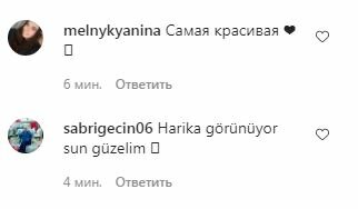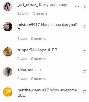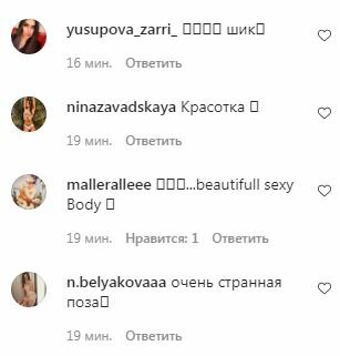 "Идеальная фигура😍🔥", "Вы прекрасны. 👌🏼", "Вау, круто", "Самая красивая ❤️🤗", "Отлично смотришься, ты красивая", "Самая красивая ❤️🤗 ", "😍😍😍😍 шик🔥", "Красотка 😍", "💖💖💖 … красивое сексуальное тело 💋", "очень странная поза😐", — написали пользователи сети.