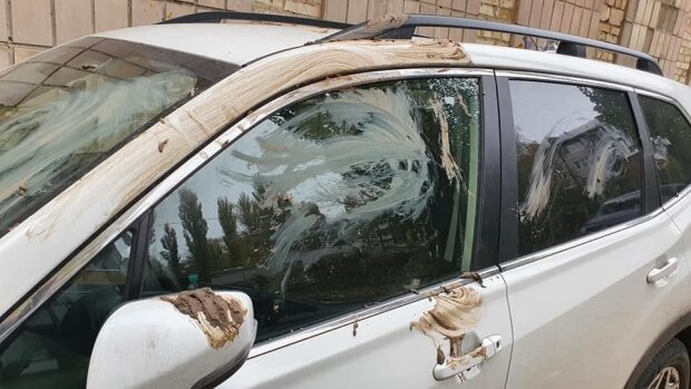 На фото – белый внедорожник, припаркованный возле хозяйственного помещения. Неизвестные измазали машину грязью.