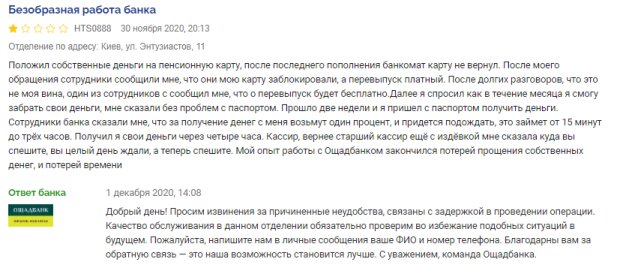"Положил собственные деньги на пенсионную карту, после последнего пополнения банкомат карту не вернул. После моего обращения сотрудники сообщили мне, что они мою карту заблокировали, а перевыпуск платный. После долгих разговоров, что это не моя вина, один из сотрудников сообщил мне, что перевыпуск будет бесплатно. Далее я спросил, как в течение месяца я смогу забрать свои деньги, мне сказали без проблем с паспортом. Прошло две недели и я пришел с паспортом получить деньги. Сотрудники банка сказали мне, что за получение денег с меня возьмут один процент, и придется подождать, это займет от 15 минут до трёх часов. Получил я свои деньги через четыре часа. Кассир, вернее старший кассир ещё с издёвкой мне сказала, куда вы спешите, вы целый день ждали, а теперь спешите. Мой опыт работы с Ощадбанком закончился потерей собственных денег, и потерей времени", — говорится в жалобе клиента.