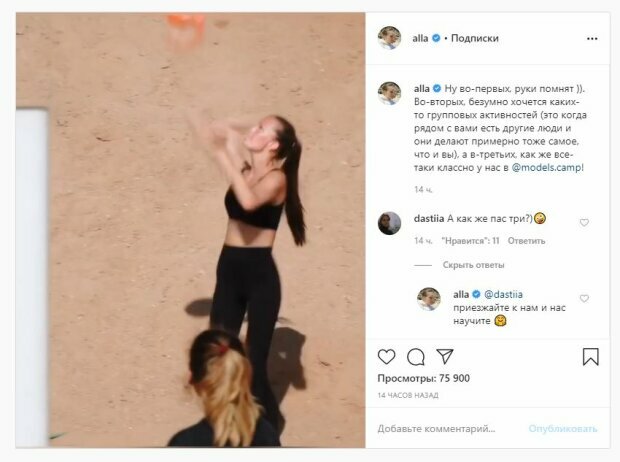 На кадрах Алла стоит в лосинах и черном топе, стоя голыми ногами на песке. Красотка играла с другими людьми в пляжный волейбол, поэтому волосы собрала в хвост, чтобы они не мешали. У Костромичевой довольно неплохо получалось играть. Видео получилось довольно солнечным и легким.