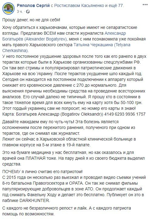 Автор просит всех неравнодушных скинуться хотя бы по 50-100 гривен на карту Богатырева.