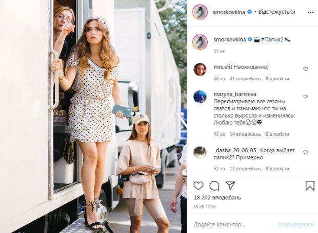 «Пересматриваю все сезоны «Сватов» и понимаю, что ты настолько выросла и изменилась! Люблю тебя», «Красота спасёт этот мир!!!! Однозначно», «Вы такая талантливая! Вот бы был новый сезон «Сватов» с вашим участием», «Куколка», «Круто, и вы будете в этом фильме)», «Невероятно красивая девушка», «Ножки огонь», — пишут пользователи сети.
