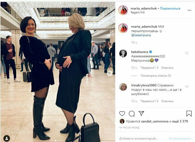 Также мы сообщали, Адамчук растрогала поклонников фото со своей беременной подругой и коллегой по "Женскому кварталу" Верой Кекелией. Адамчук покривлялась, будто тоже в положении, выпятив свой животик. Ее выходка позабавила смеющуюся на фото Кекелию.