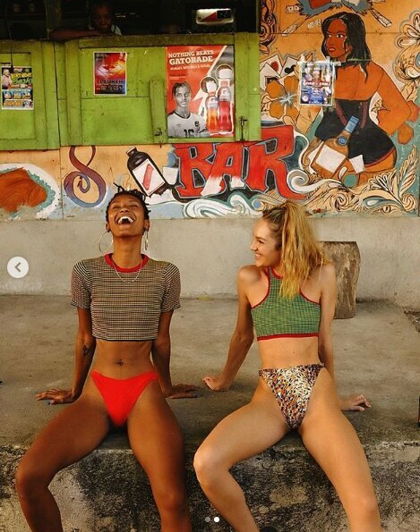 Звезда подиумов позировала рядом с экзотической длинноногой красавицей — та тоже была в купальнике, при всем при этом — дамы расставили ноги на камеру и смотрели друг на друга улыбаясь.